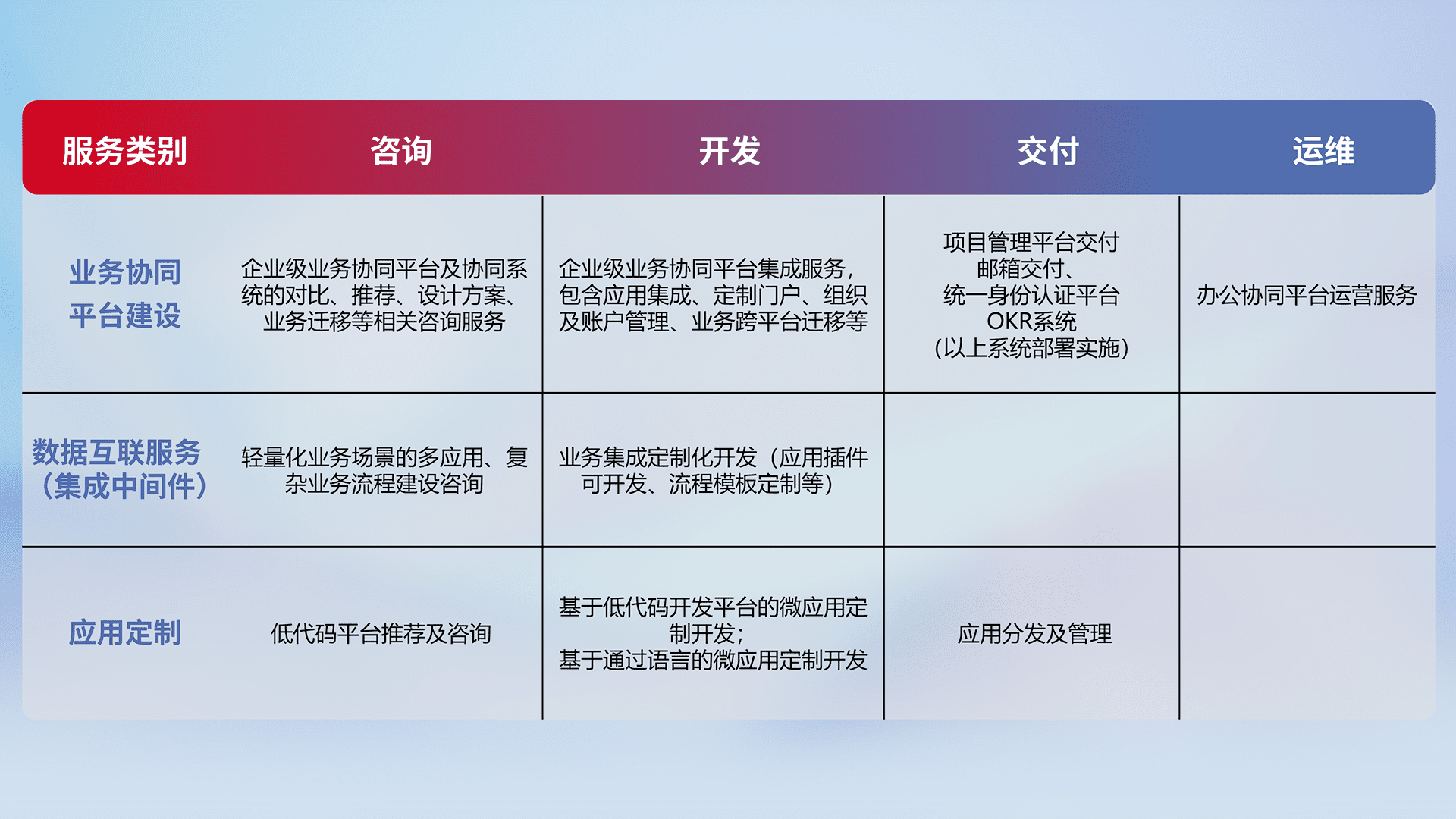 针对钉钉、、、、企微、、、IDaas等平台级产品提供产品的规划、、方案、、交付、、定制化开发等服务,,,,实现如统一协同办公、、智能客户服务、、、混合会议管理、、、、智能数据查询、、、、等业务场景,,,,实现数字化转型。。
